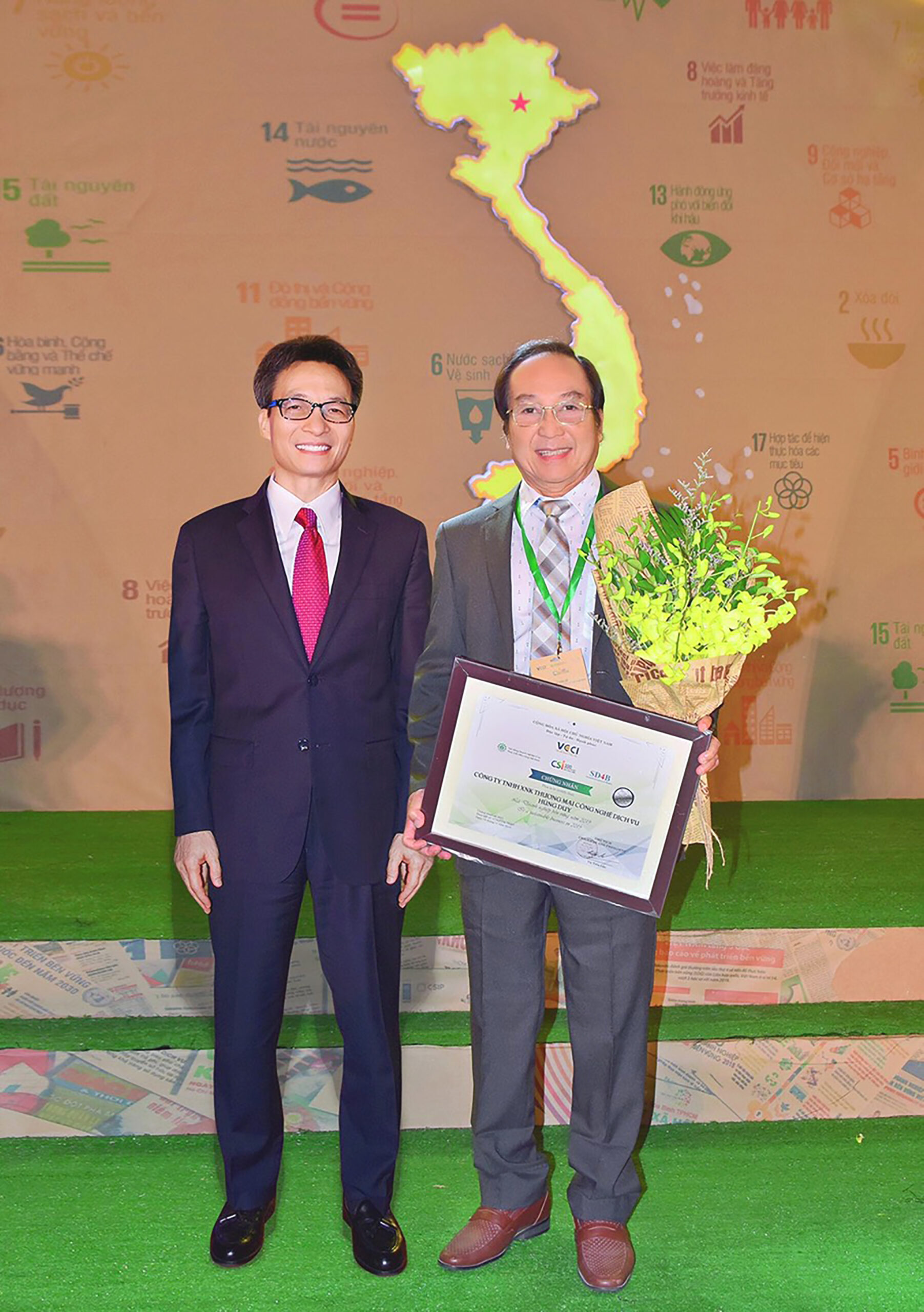 Phó Thủ tướng Vũ Đức Đam & Chủ tịch HĐTV Công Ty Hùng Duy chụp ảnh lưu niệm tại lễ trao giải thưởng doanh nghiệp bền vững Việt Nam 2019